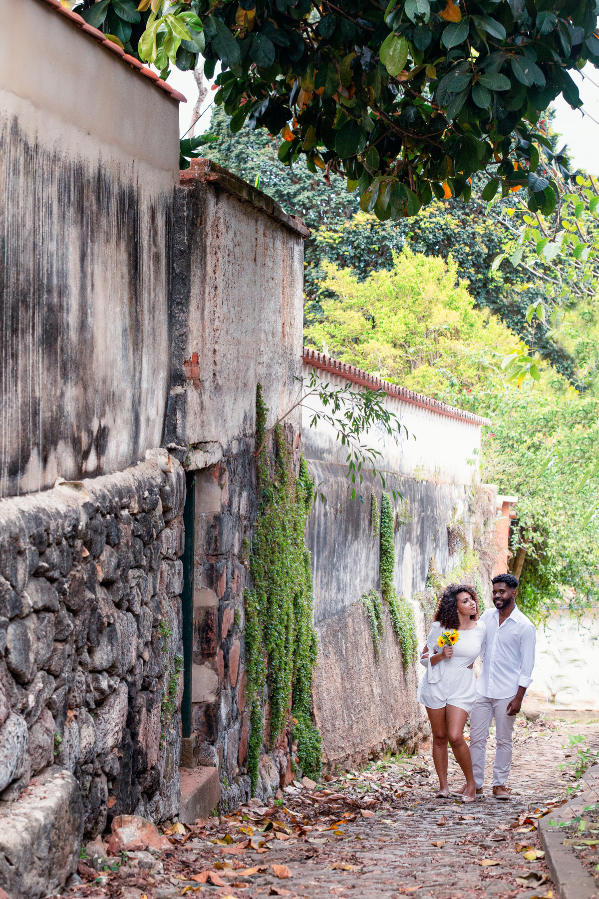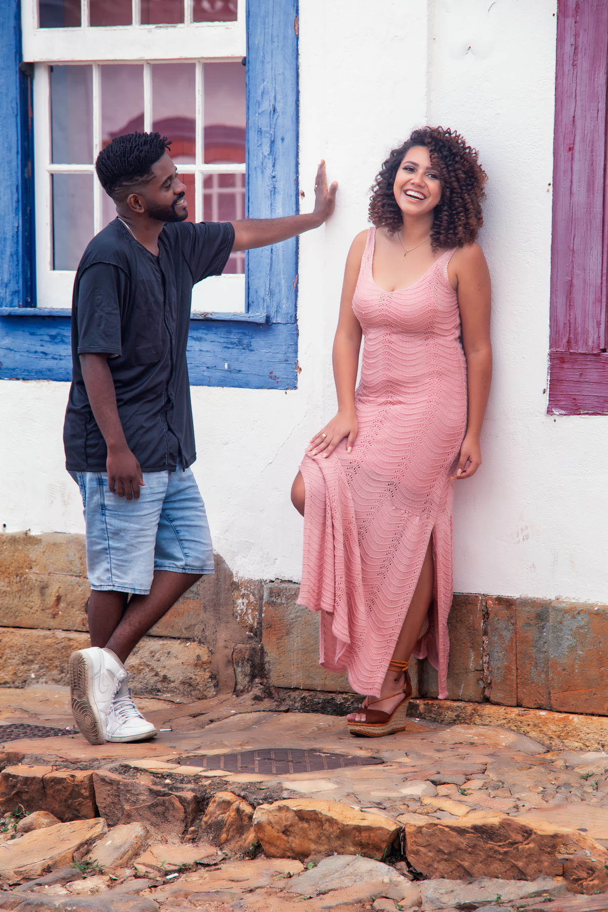 Noivo apoiado na parede e noiva encostada na parede em Tiradentes Minas Gerais
