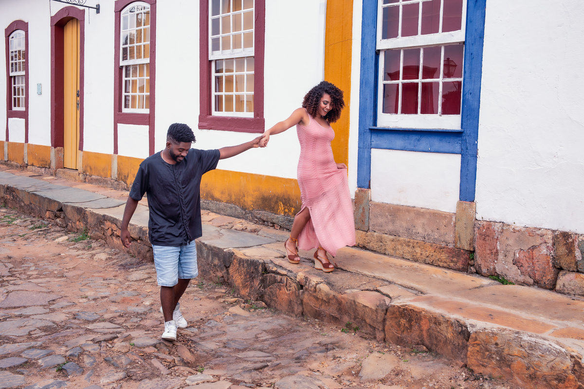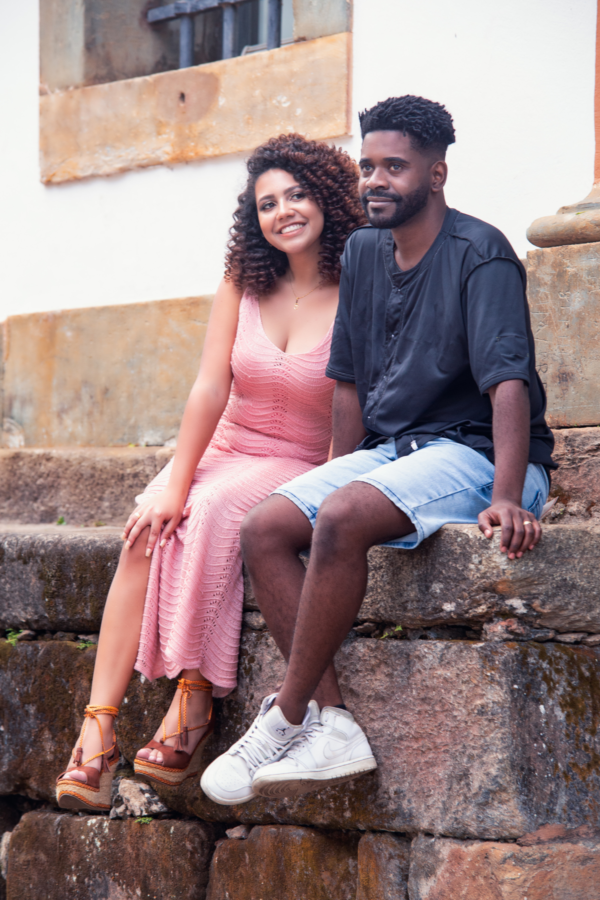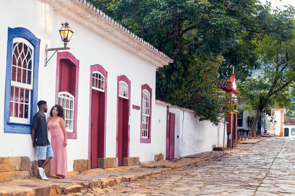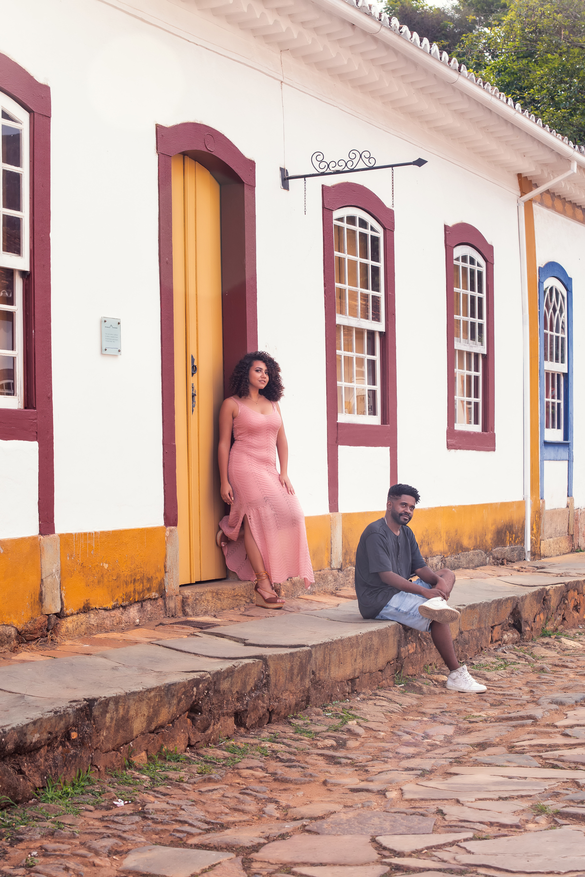 Casal na sentado na porta da igreja matriz Tiradentes Minas Gerais
