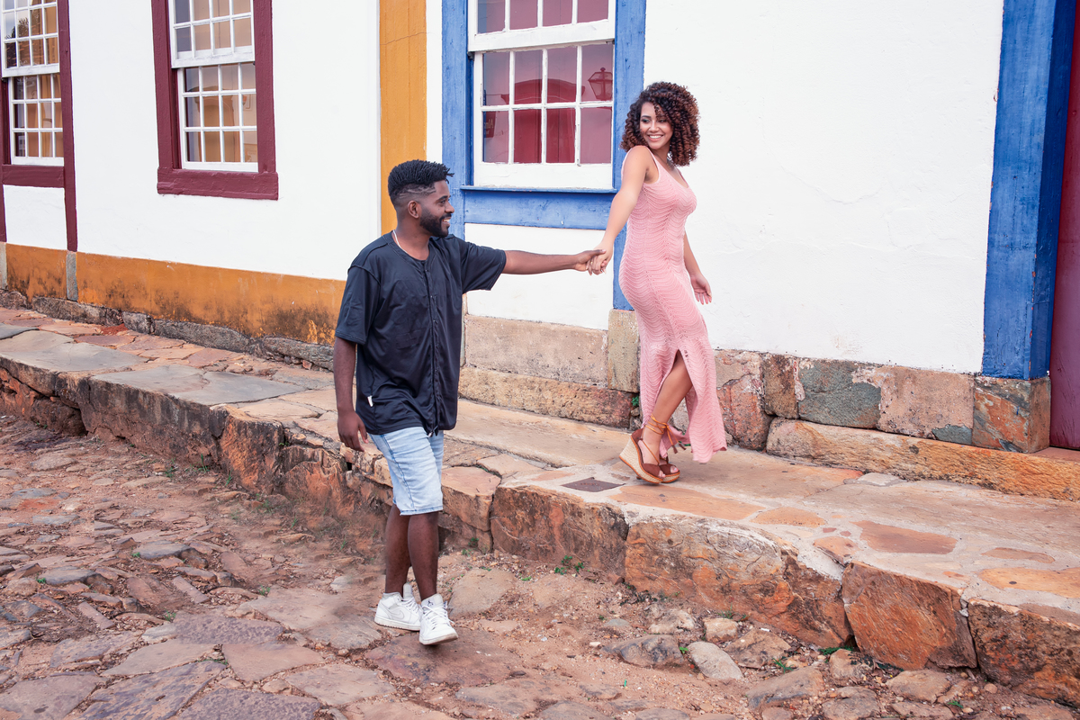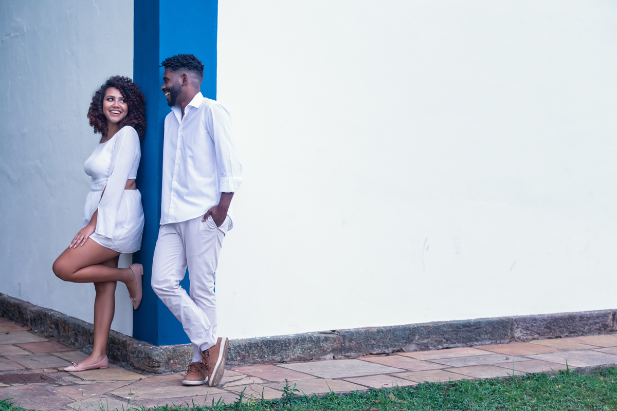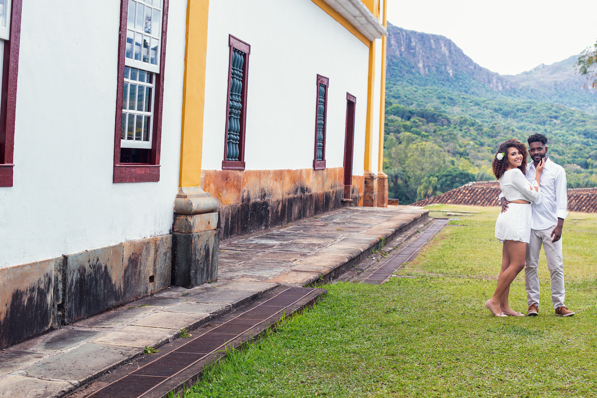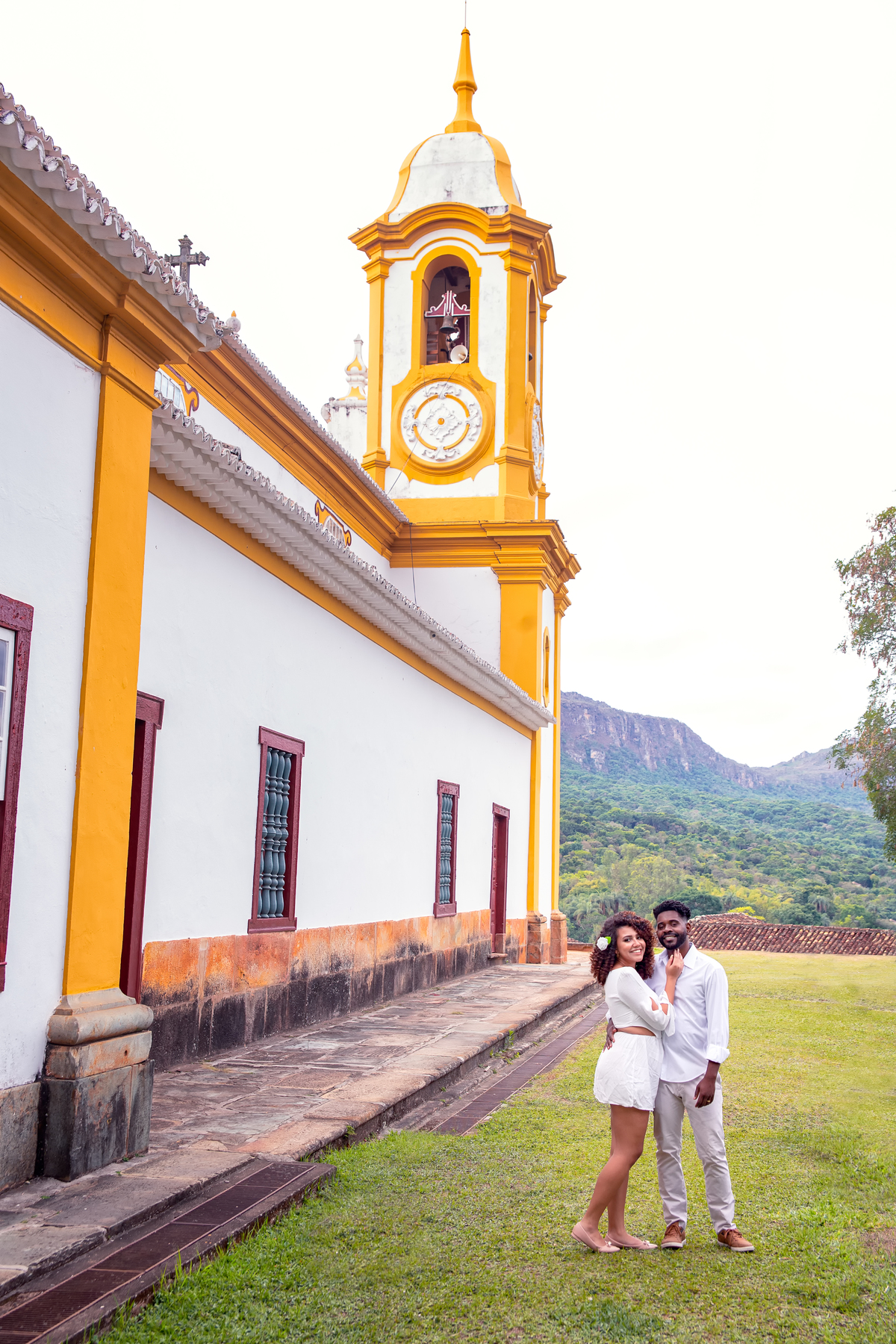 Casal sorrindo em close na igreja matriz de Tiradentes Minas Gerais ensaio prdé wedding