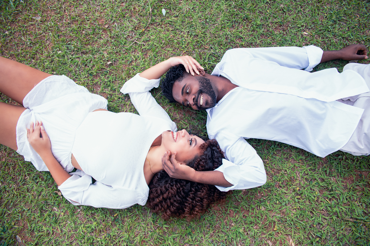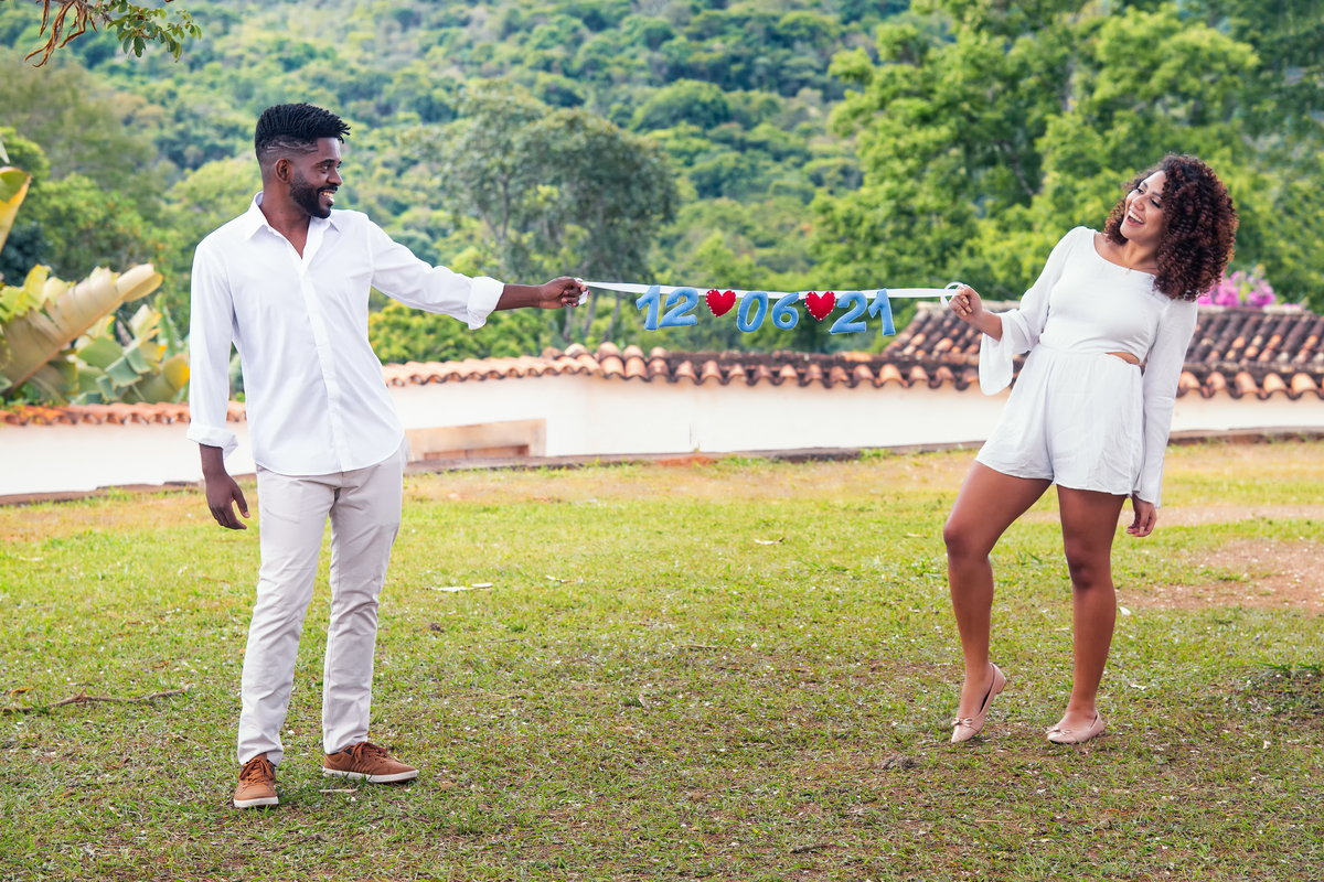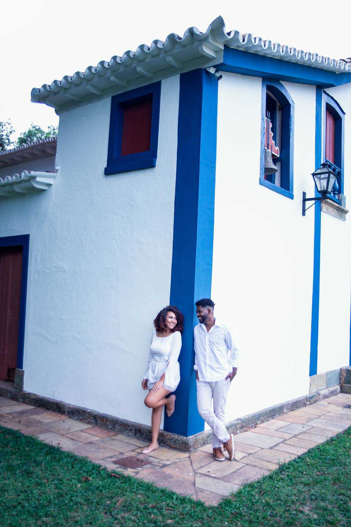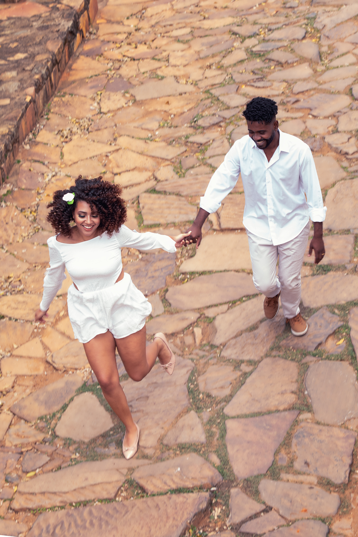 Casal correndo vestidos de branco em ensaio pré wedding Tiradentes Minas Gerais