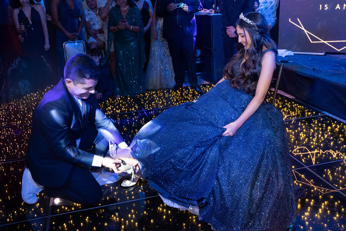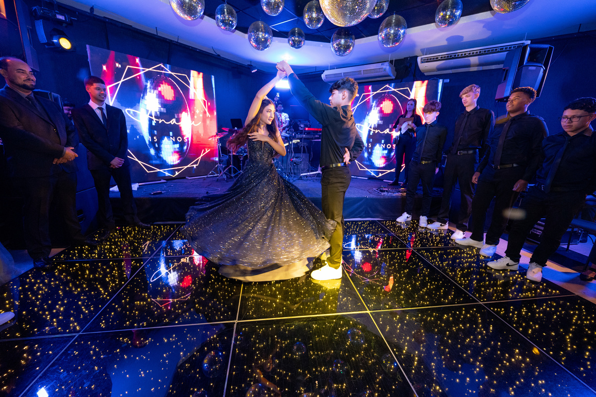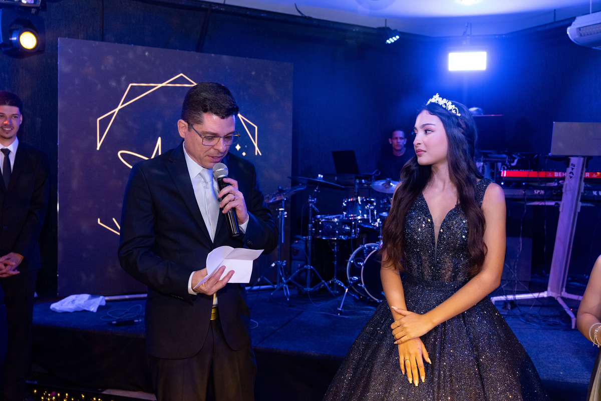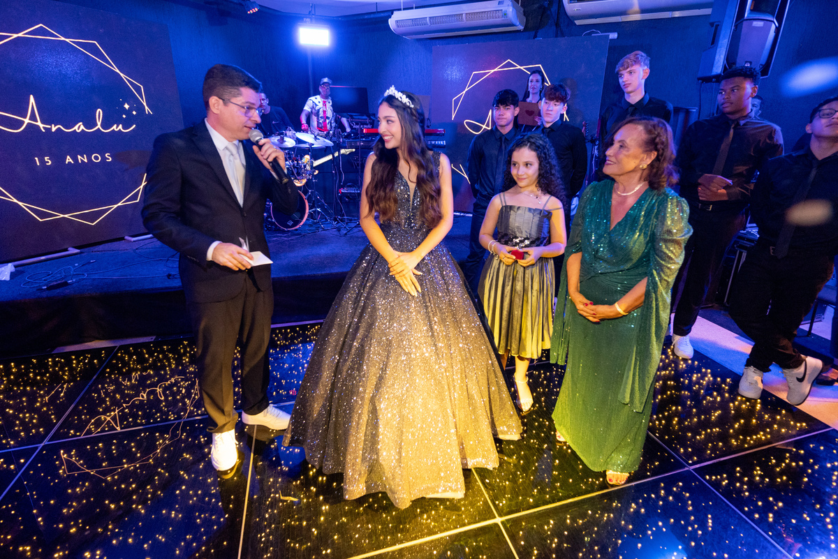 A festa de 15 anos da Analu foi um verdadeiro conto de fadas moderno! O evento aconteceu em um ambiente cuidadosamente decorado, que misturava elegância e jovialidade, refletindo perfeitamente a personalidade dela. Cada detalhe foi pensado com carinho, desde as flores que enfeitavam o salão até as luzes que criaram um clima mágico.