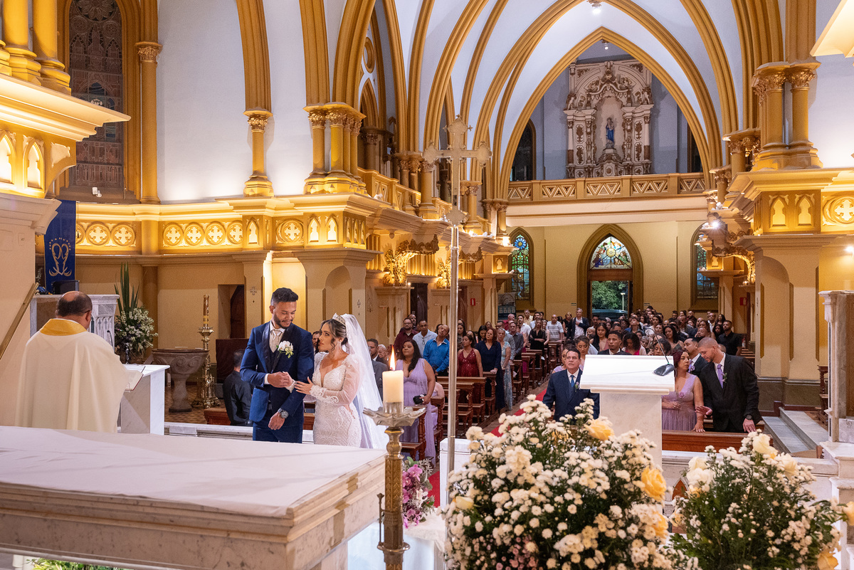 Para a cerimônia religiosa de Kézia e Mateus, o cenário escolhido foi a majestosa Igreja Nossa Senhora da Boa Viagem, no coração de Belo Horizonte. Com sua arquitetura imponente e ambiente sagrado, o local trouxe uma atmosfera solene e ao mesmo tempo acolhedora para o casal.