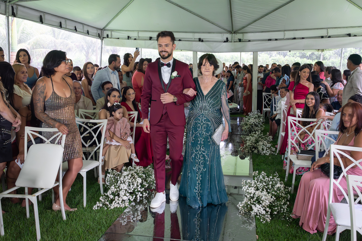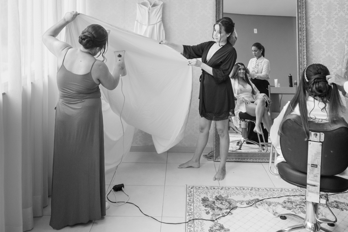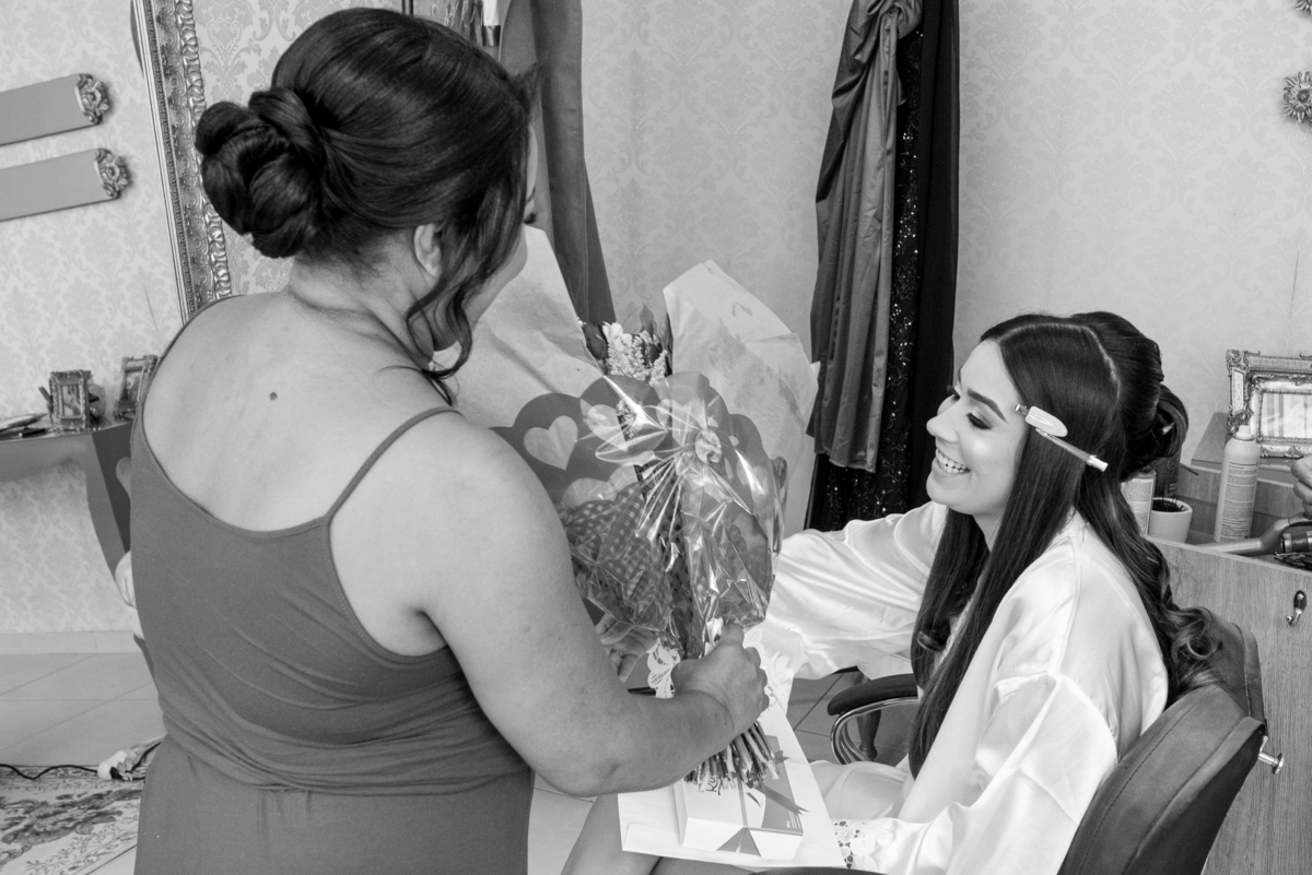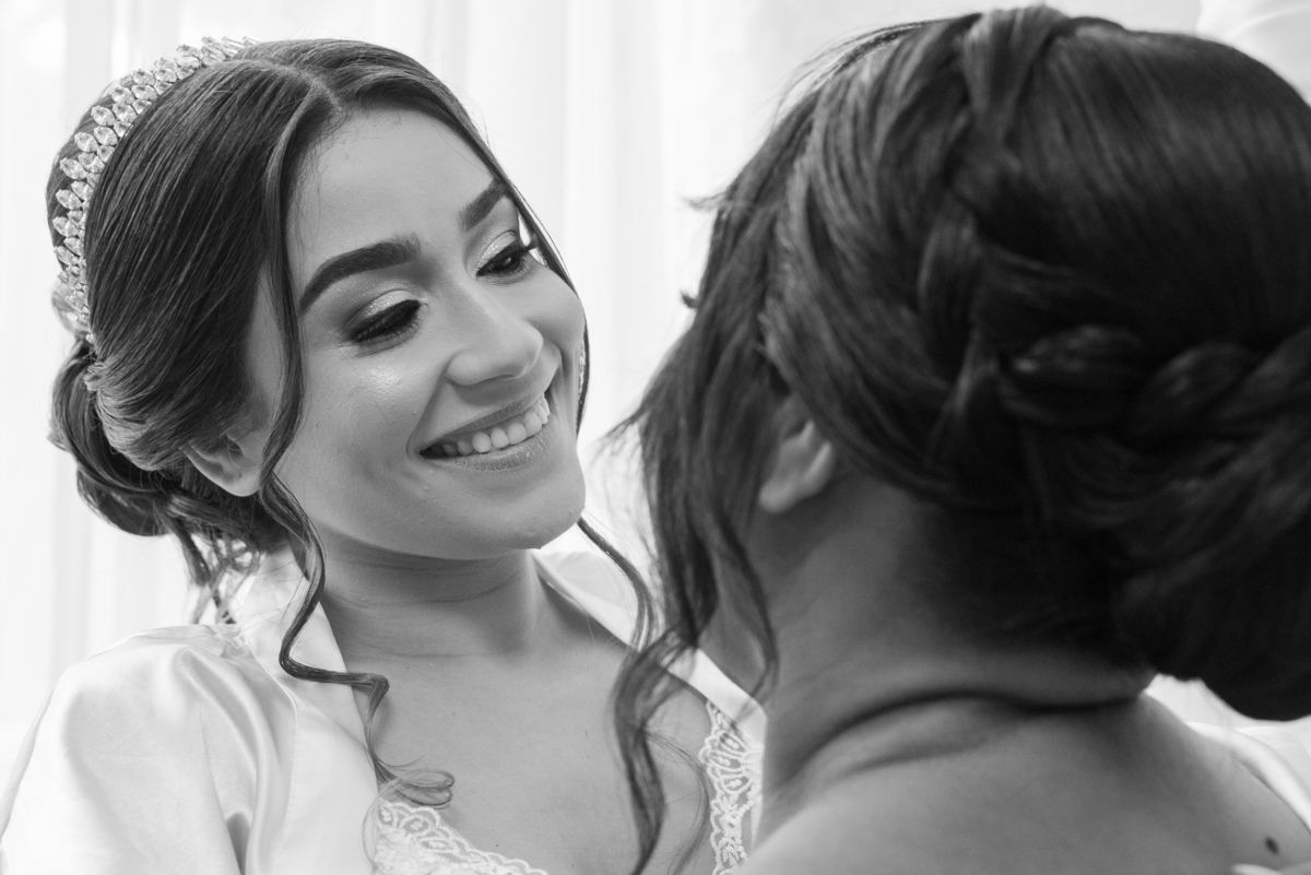 O dia começou com o making of da noiva, em um ambiente leve, cheio de risadas, carinho e expectativa. Janaína estava radiante enquanto se preparava ao lado das madrinhas e familiares. Cada detalhe do vestido, da maquiagem e dos acessórios foi cuidadosamente registrado, criando memórias preciosas desse momento tão íntimo.