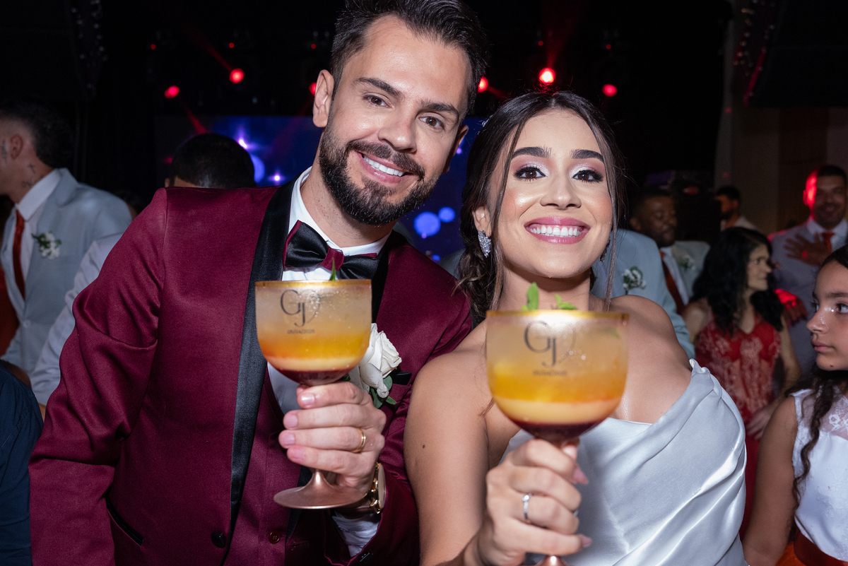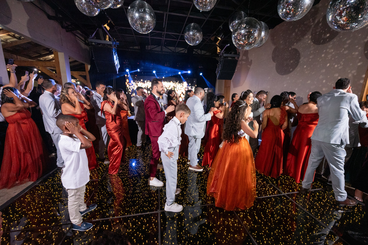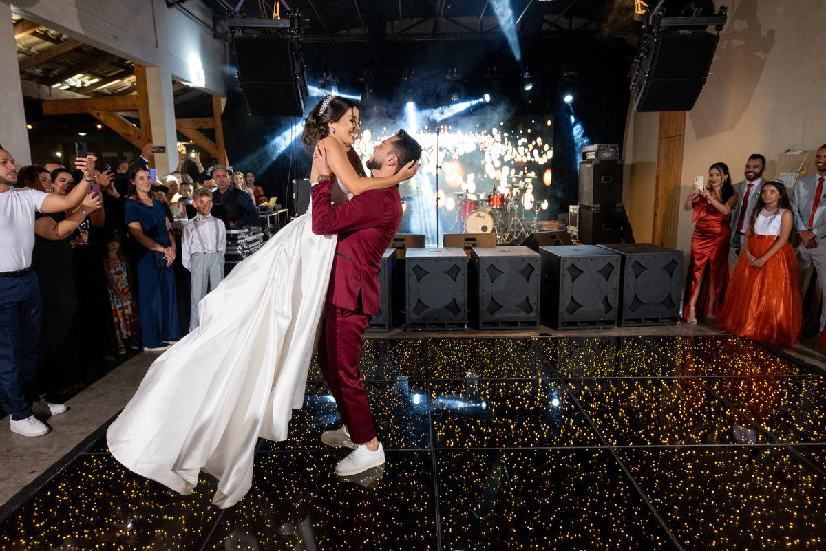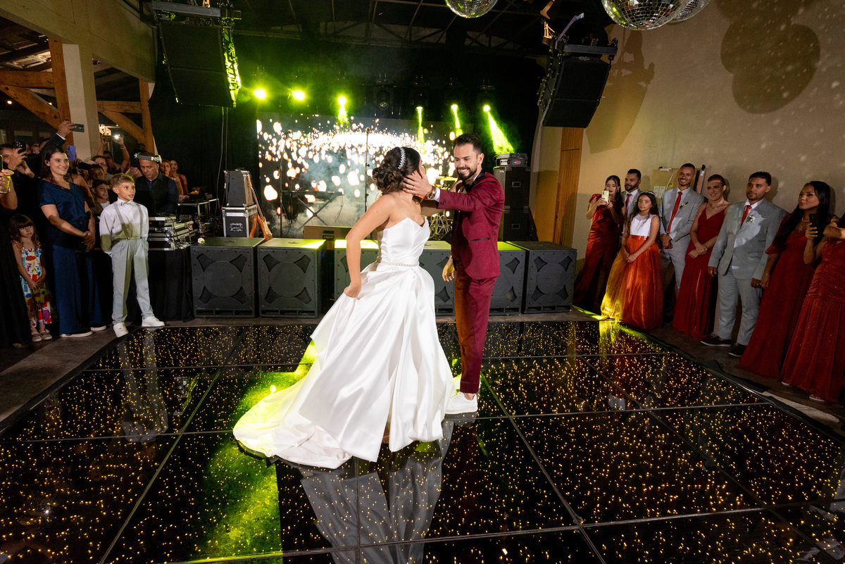 Já a recepção do casamento foi pura alegria! A chuva deu lugar a uma noite de celebração intensa. Os noivos, cercados por amigos e familiares, aproveitaram cada segundo da festa. A pista de dança ficou cheia do início ao fim, com abraços calorosos, músicas animadas e muita emoção no ar.