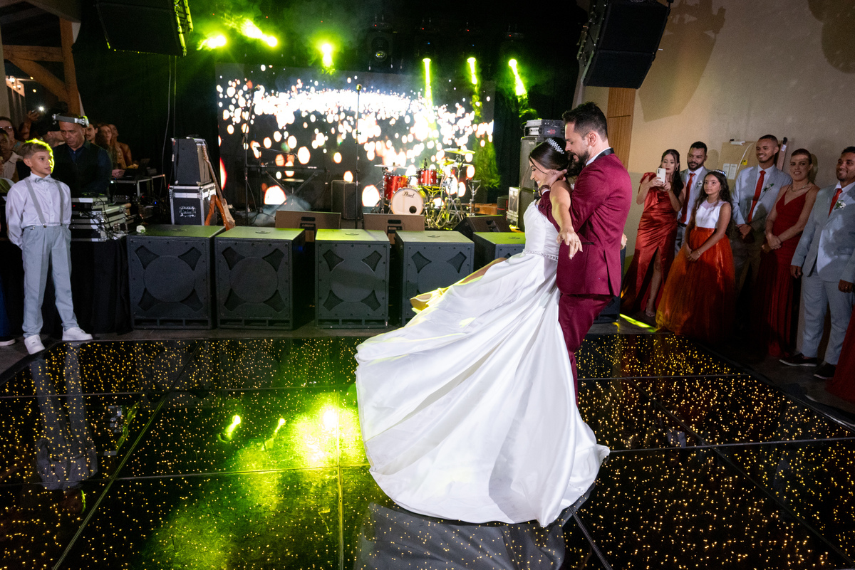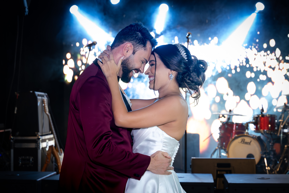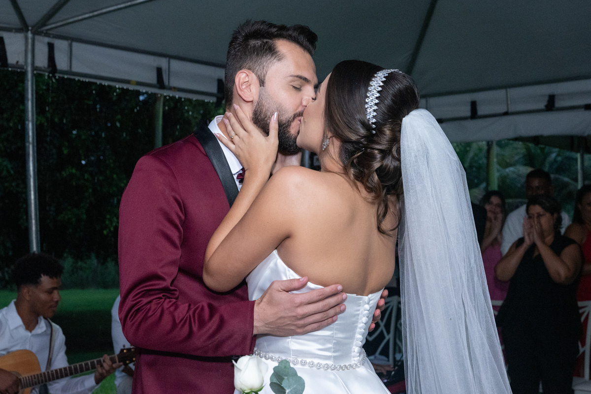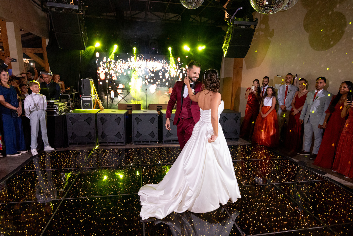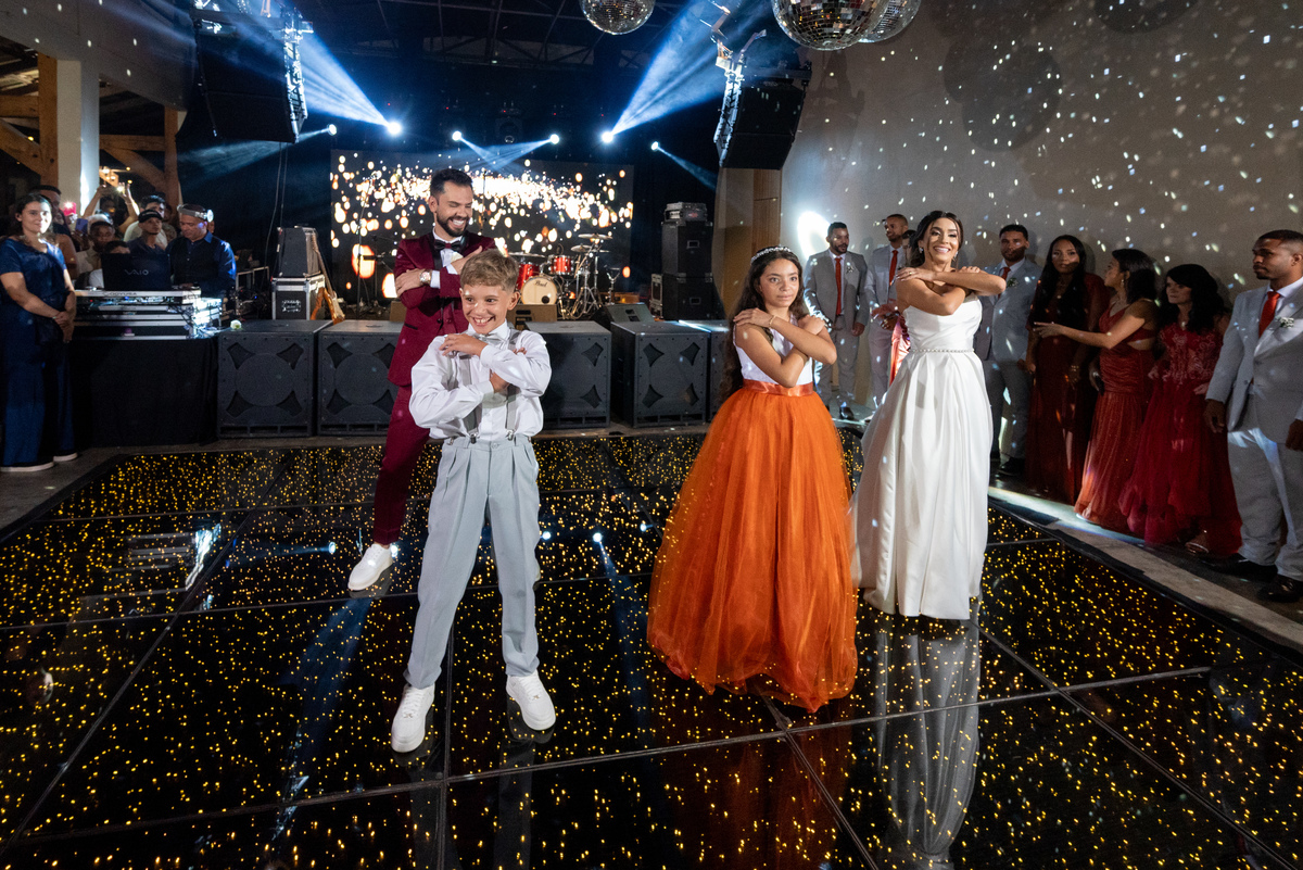Já a recepção do casamento foi pura alegria! A chuva deu lugar a uma noite de celebração intensa. Os noivos, cercados por amigos e familiares, aproveitaram cada segundo da festa. A pista de dança ficou cheia do início ao fim, com abraços calorosos, músicas animadas e muita emoção no ar.