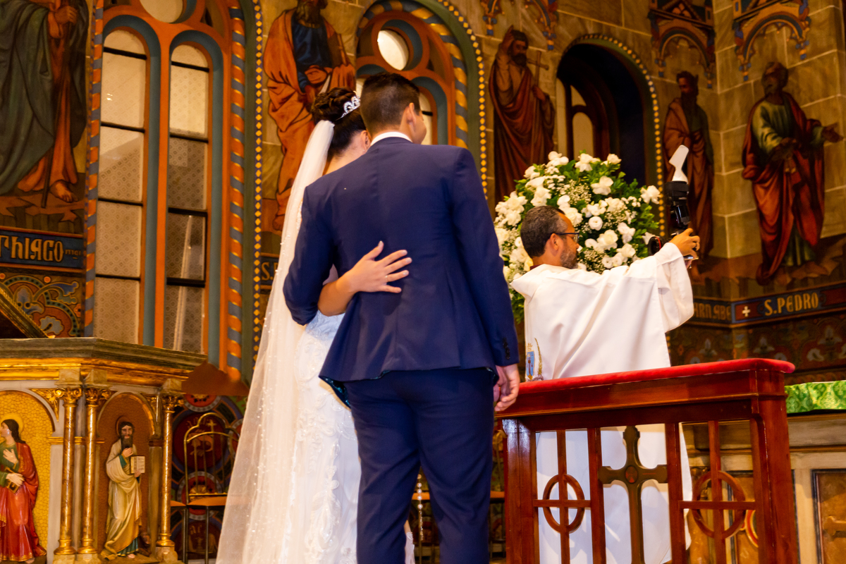 o celebrante da igreja são josé de belo horizonte pega a máquina do fotógrafo para fazer uma selfie com os noivos