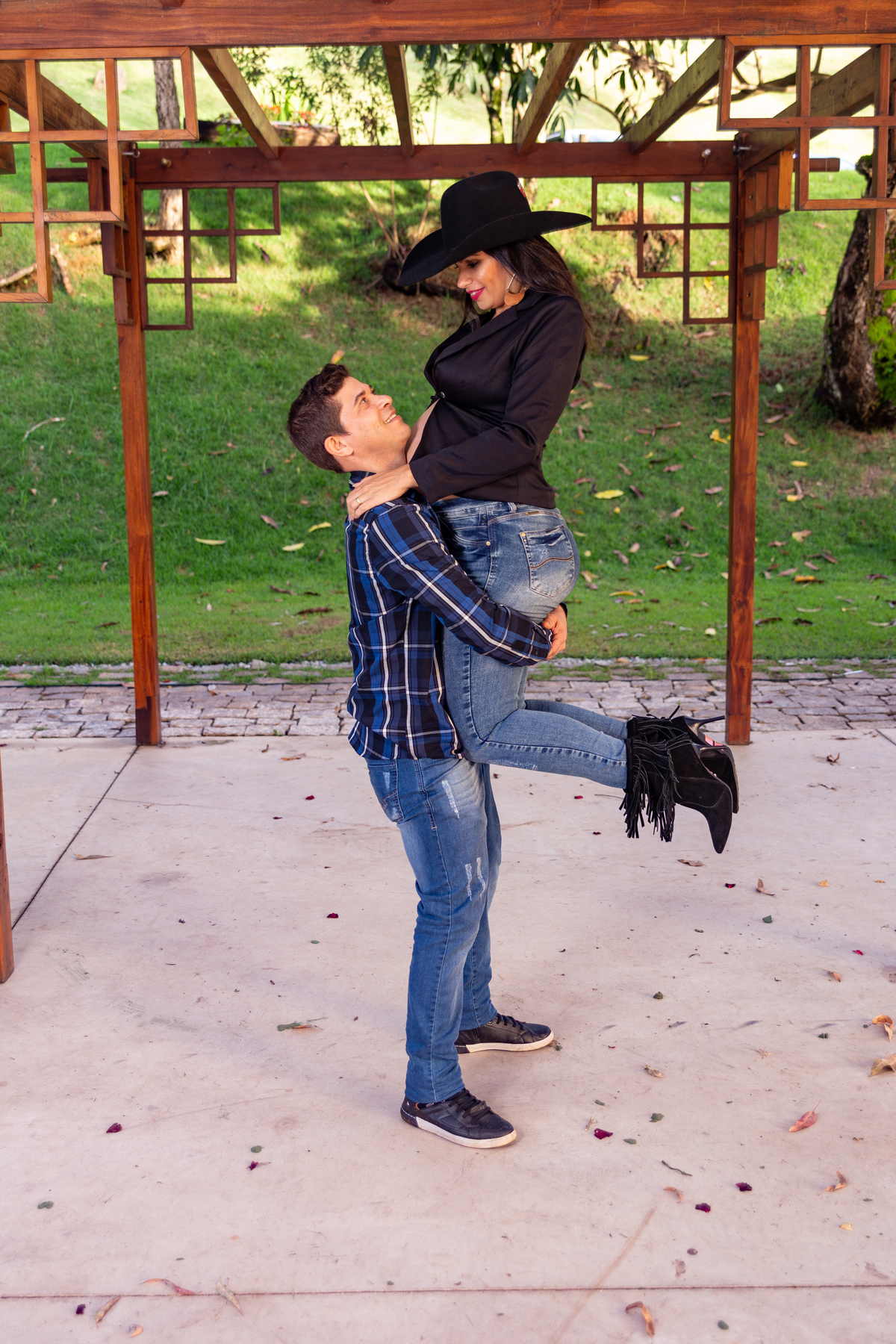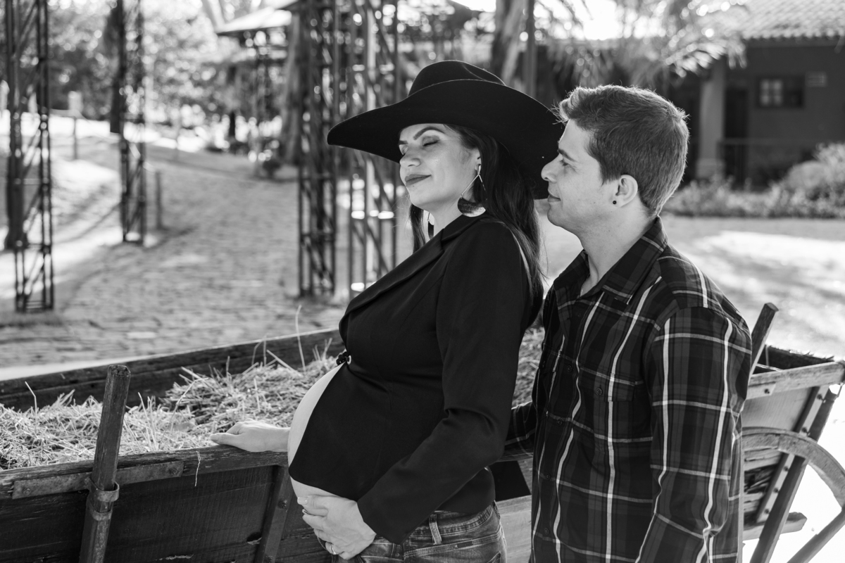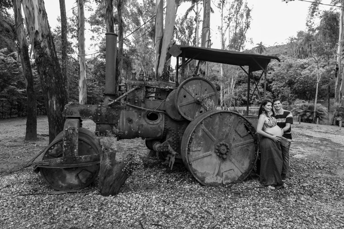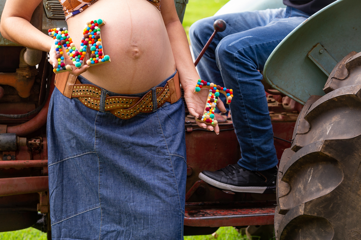 casal gestante abraçados ele com a mão na barriga dela e ela com a mão na roda do trator fazenda arraial velho