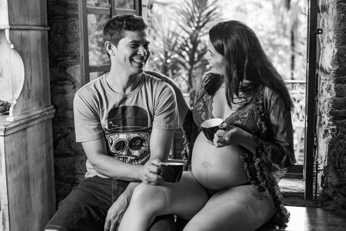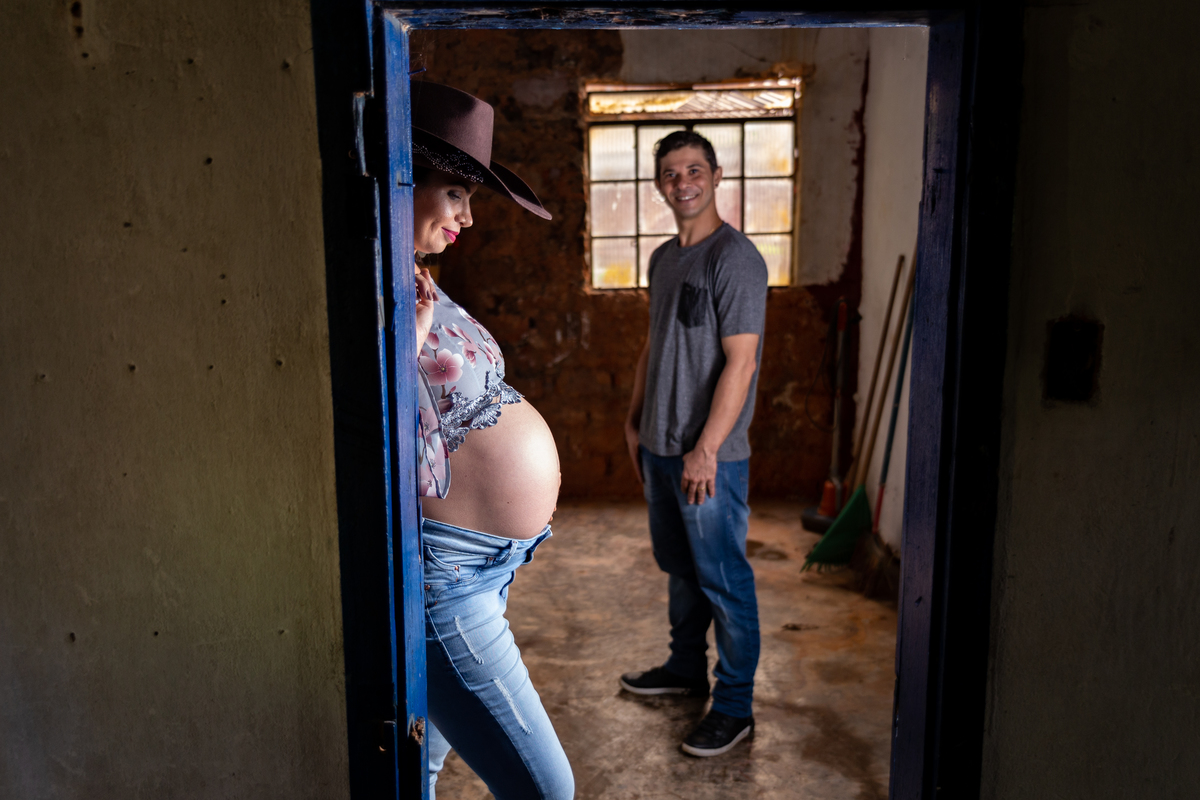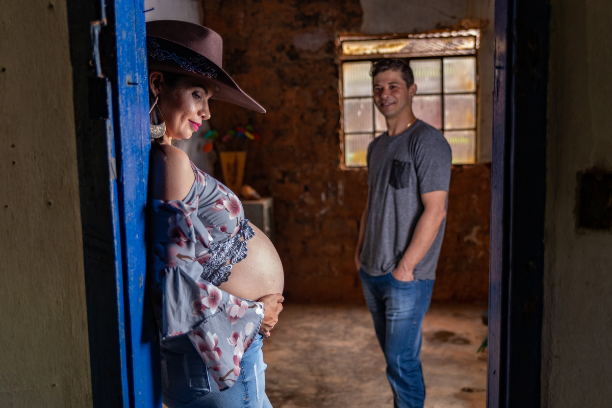 gestante sentada no colo do seu marido na porta de uma casinha de barro na fazenda arraial velho na foto de juca sousa