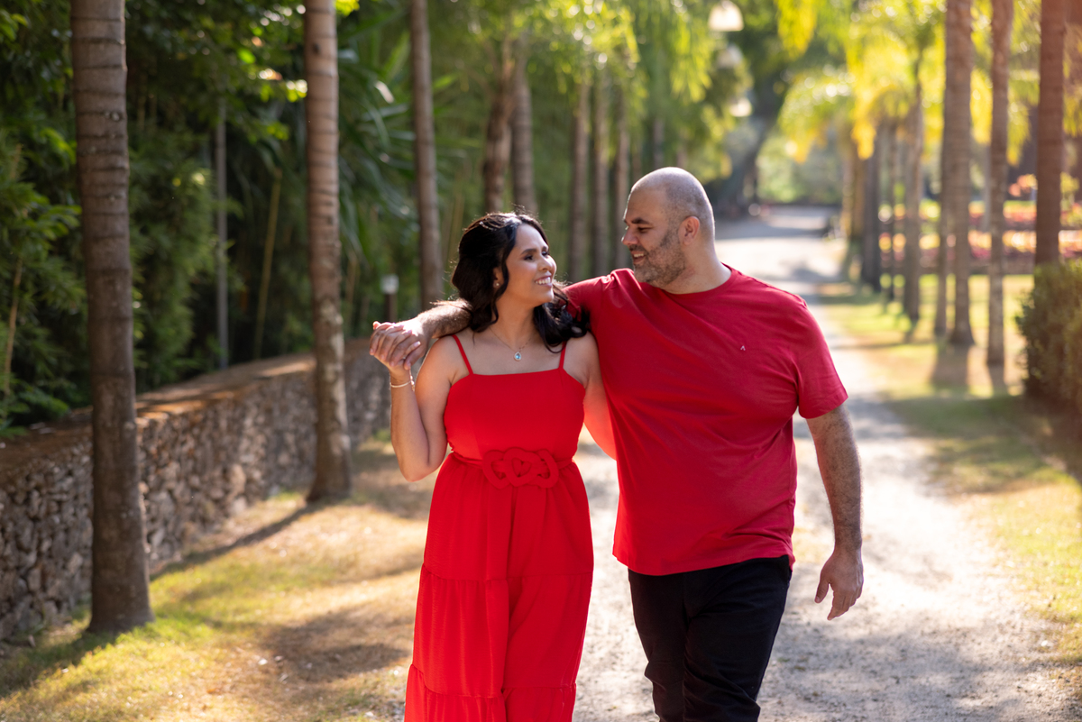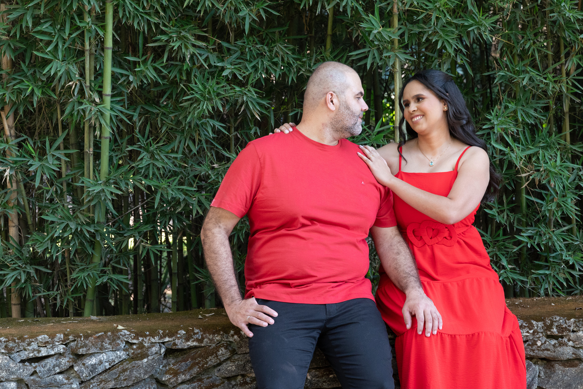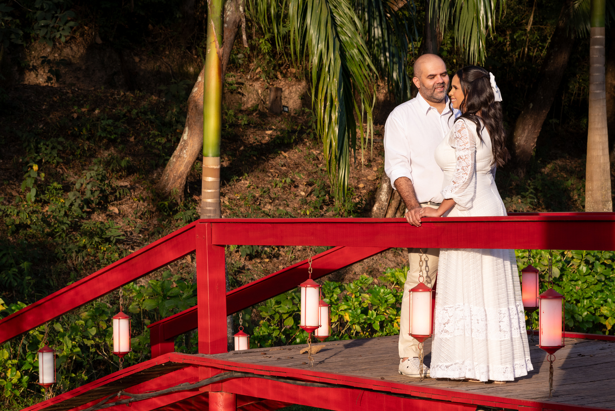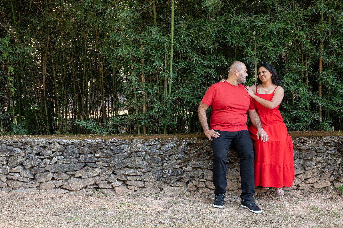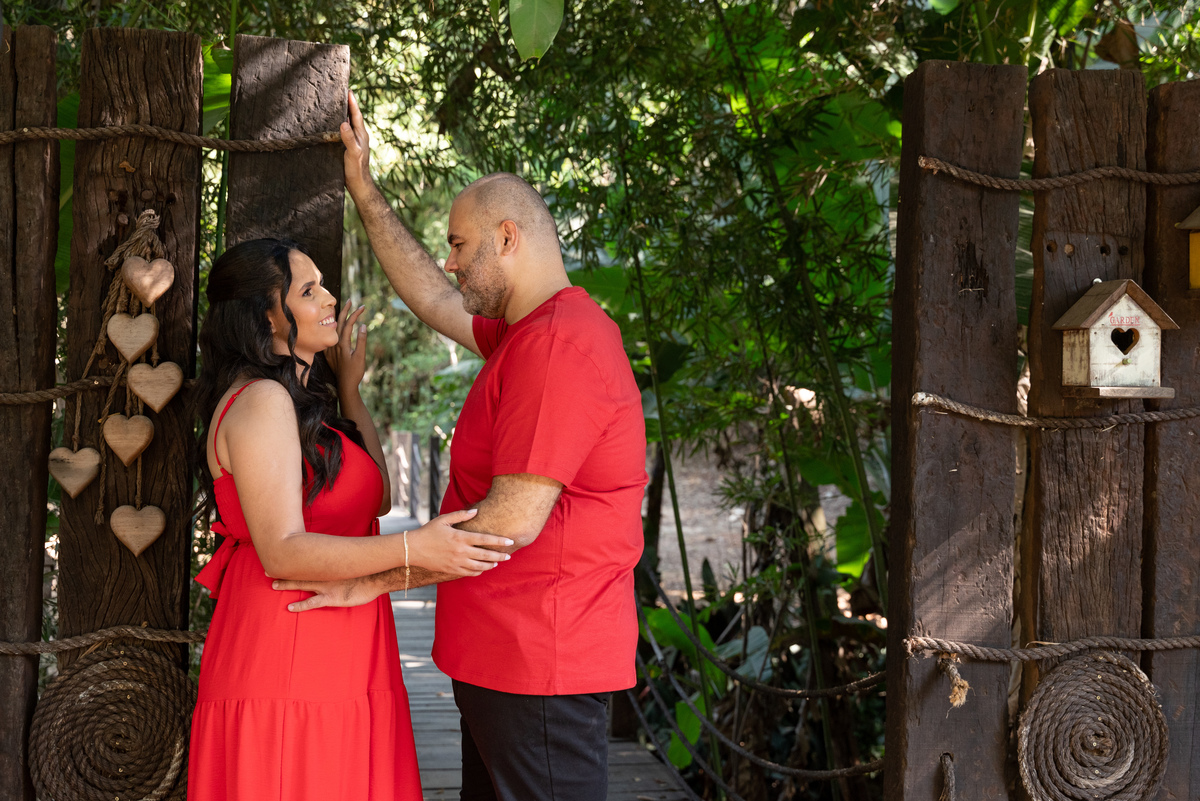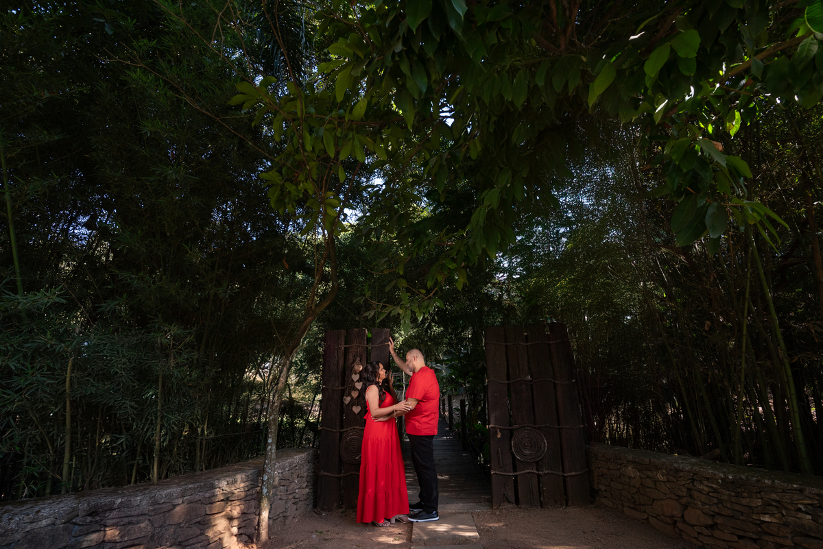 Cada canto do Espaço Sanctuarium foi utilizado de maneira criativa. Desde o coreto rústico, que adicionou um toque clássico às fotos, até os arcos floridos que emolduravam o casal, cada detalhe contribuiu para a criação de memórias inesquecíveis. O ensaio também incluiu momentos divertidos, como o casal brincando em uma ponte charmosa e correndo pelos gramados verdes.