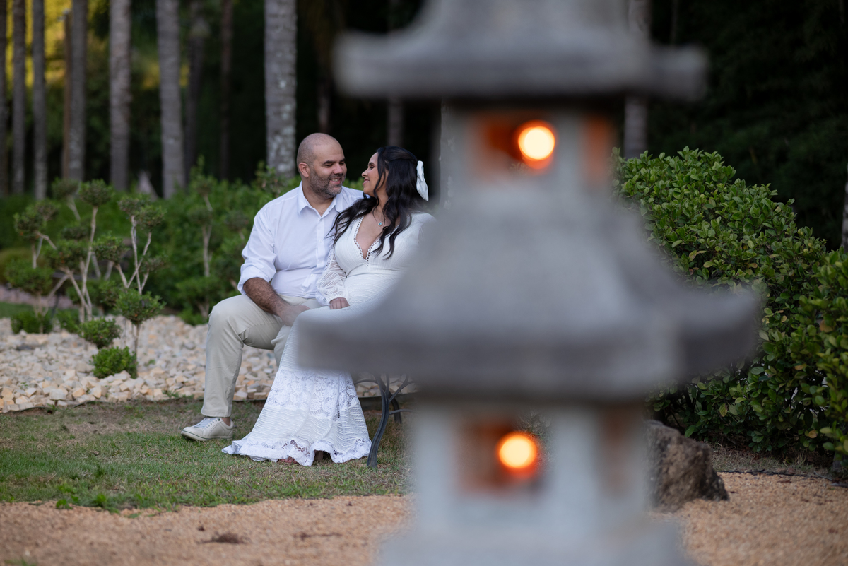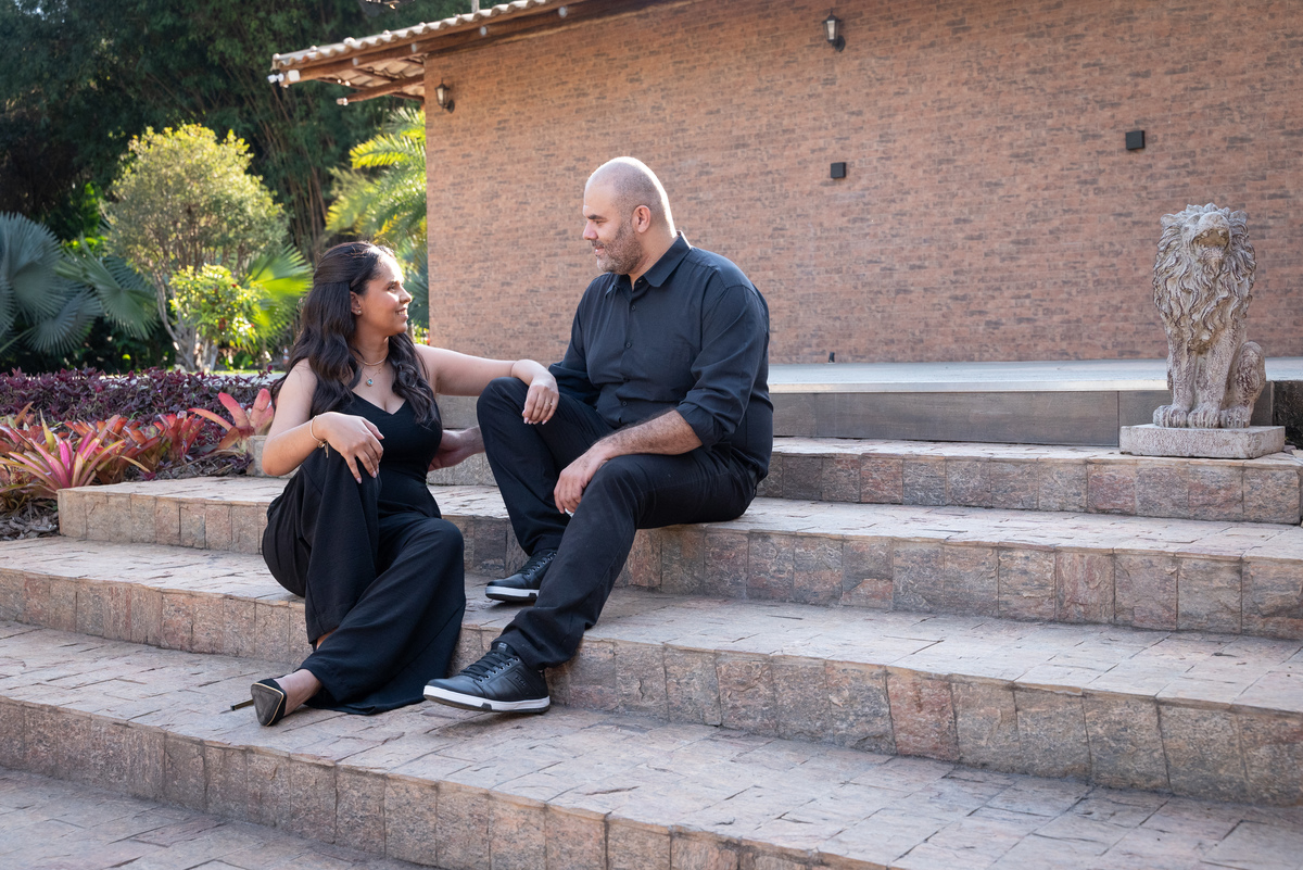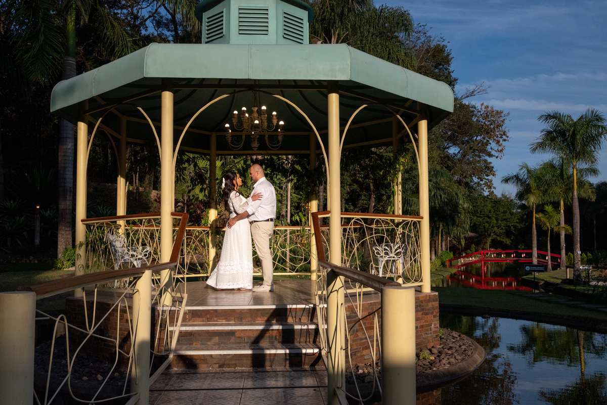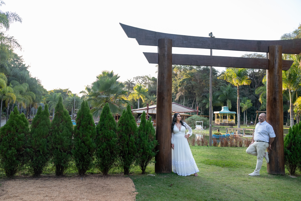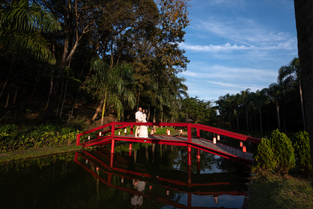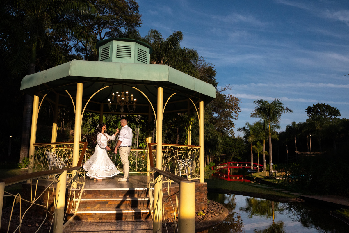O ponto alto do ensaio foi ao pôr do sol. Com o céu azul Isabela e Bruno se posicionaram em frente ao lago do Espaço Sanctuarium, cujas águas refletiam as cores vibrantes do entardecer. Aproveitamos esse momento mágico para capturar imagens que mais pareciam pinturas, com o casal abraçado, trocando olhares apaixonados.