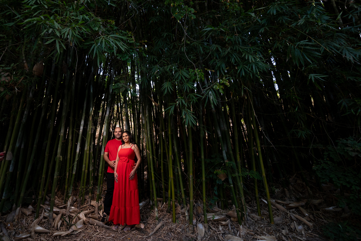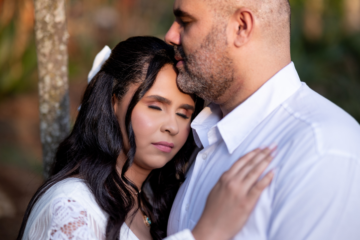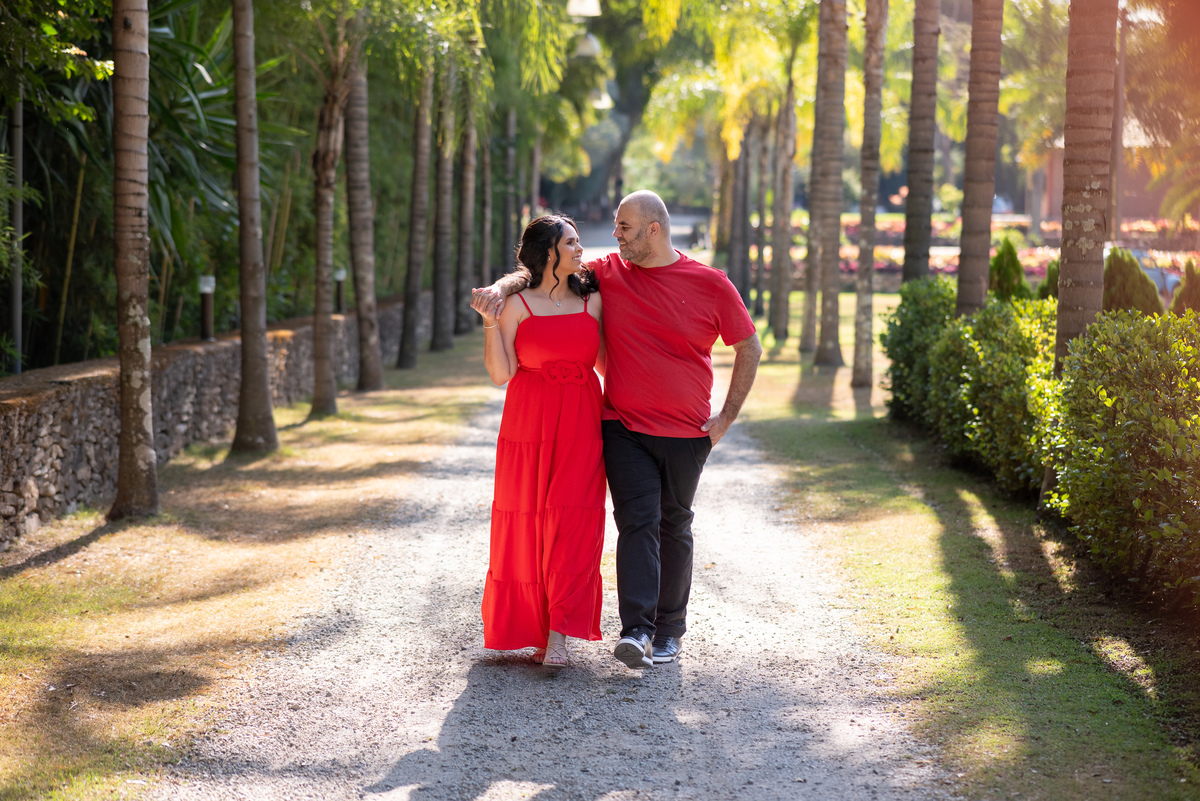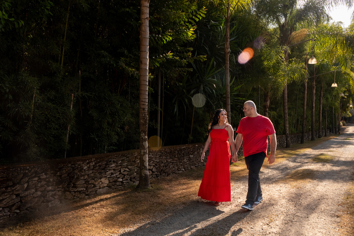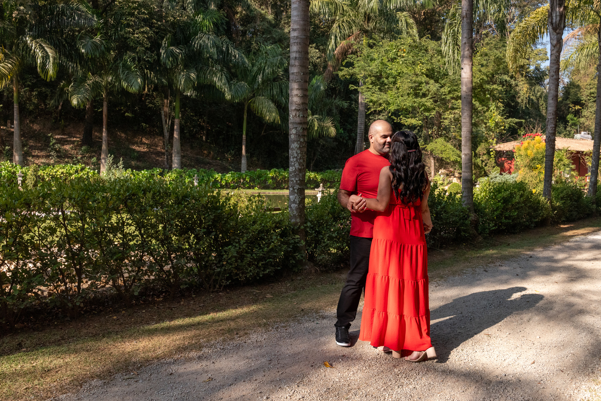 O ponto alto do ensaio foi ao pôr do sol. Com o céu azul Isabela e Bruno se posicionaram em frente ao lago do Espaço Sanctuarium, cujas águas refletiam as cores vibrantes do entardecer. Aproveitamos esse momento mágico para capturar imagens que mais pareciam pinturas, com o casal abraçado, trocando olhares apaixonados.