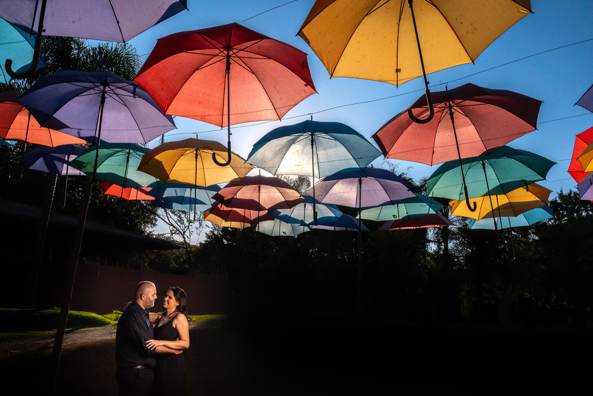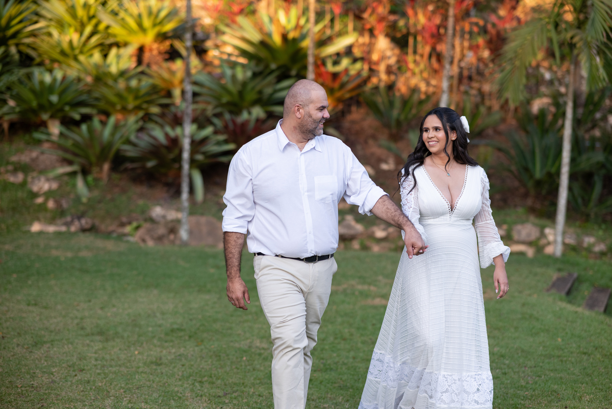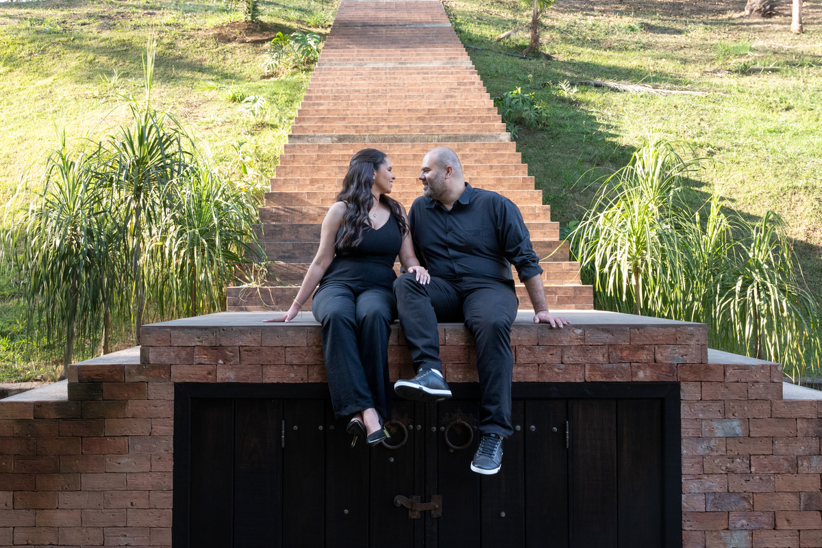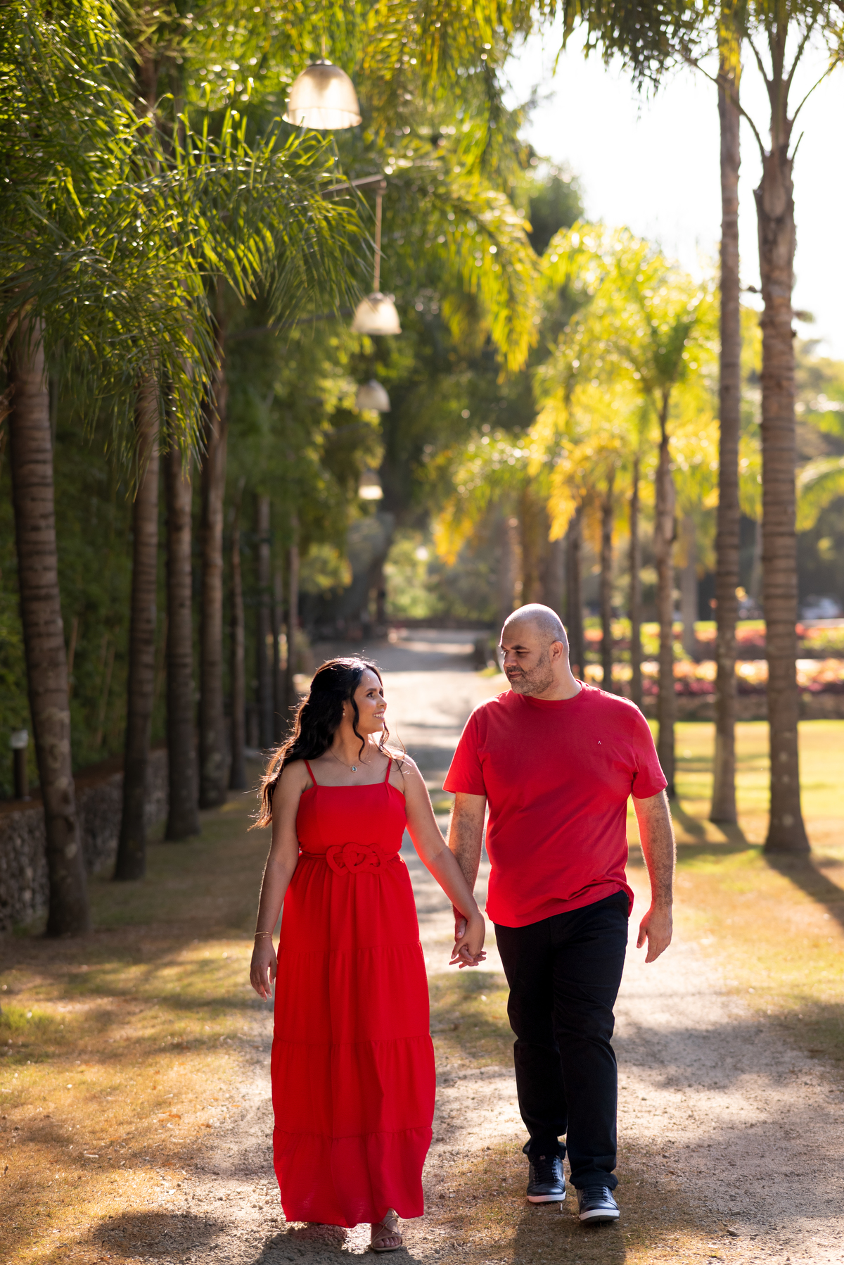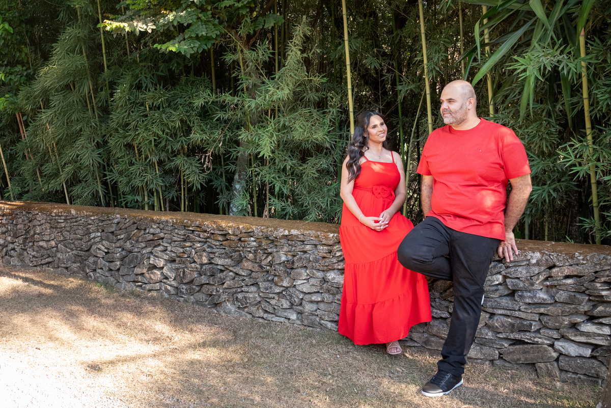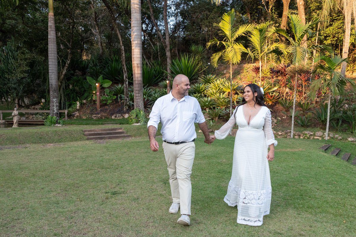 O ponto alto do ensaio foi ao pôr do sol. Com o céu azul Isabela e Bruno se posicionaram em frente ao lago do Espaço Sanctuarium, cujas águas refletiam as cores vibrantes do entardecer. Aproveitamos esse momento mágico para capturar imagens que mais pareciam pinturas, com o casal abraçado, trocando olhares apaixonados.