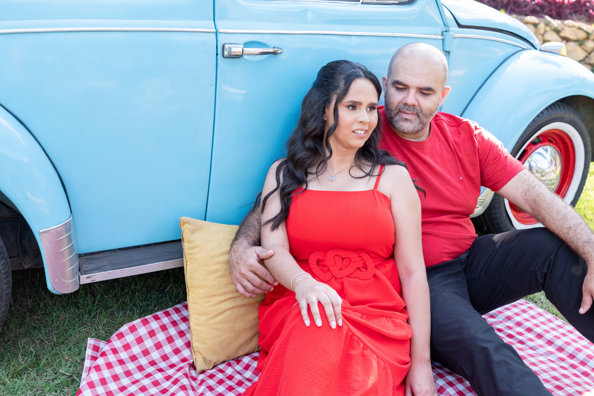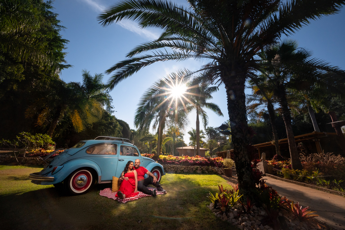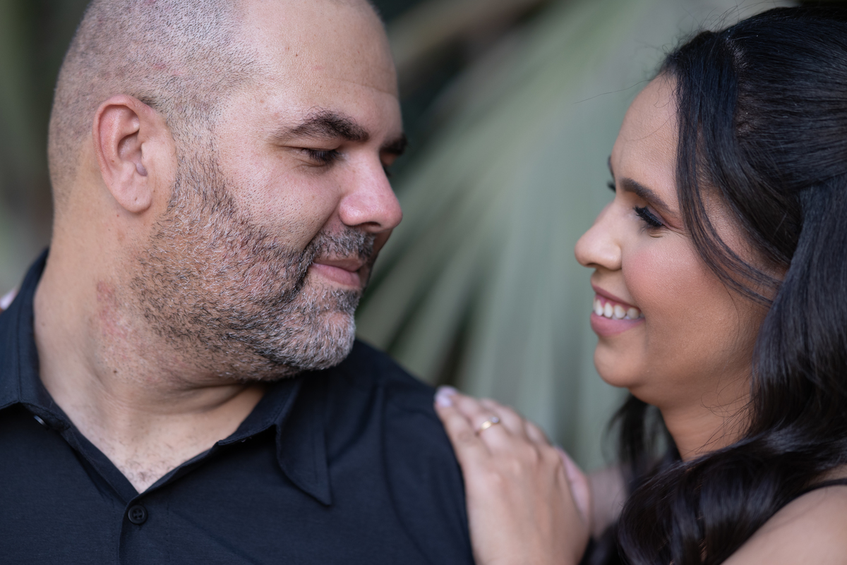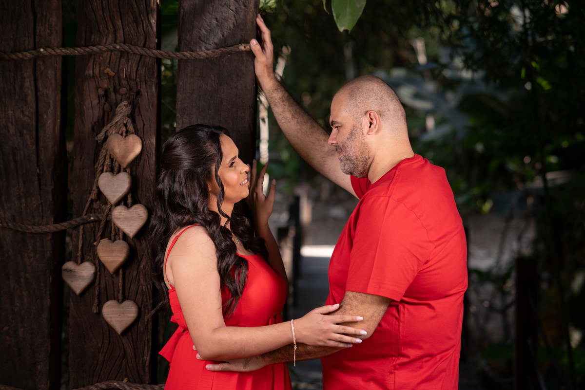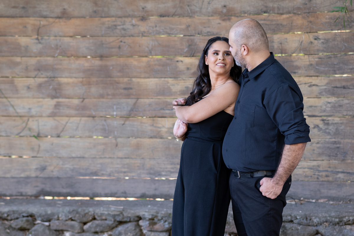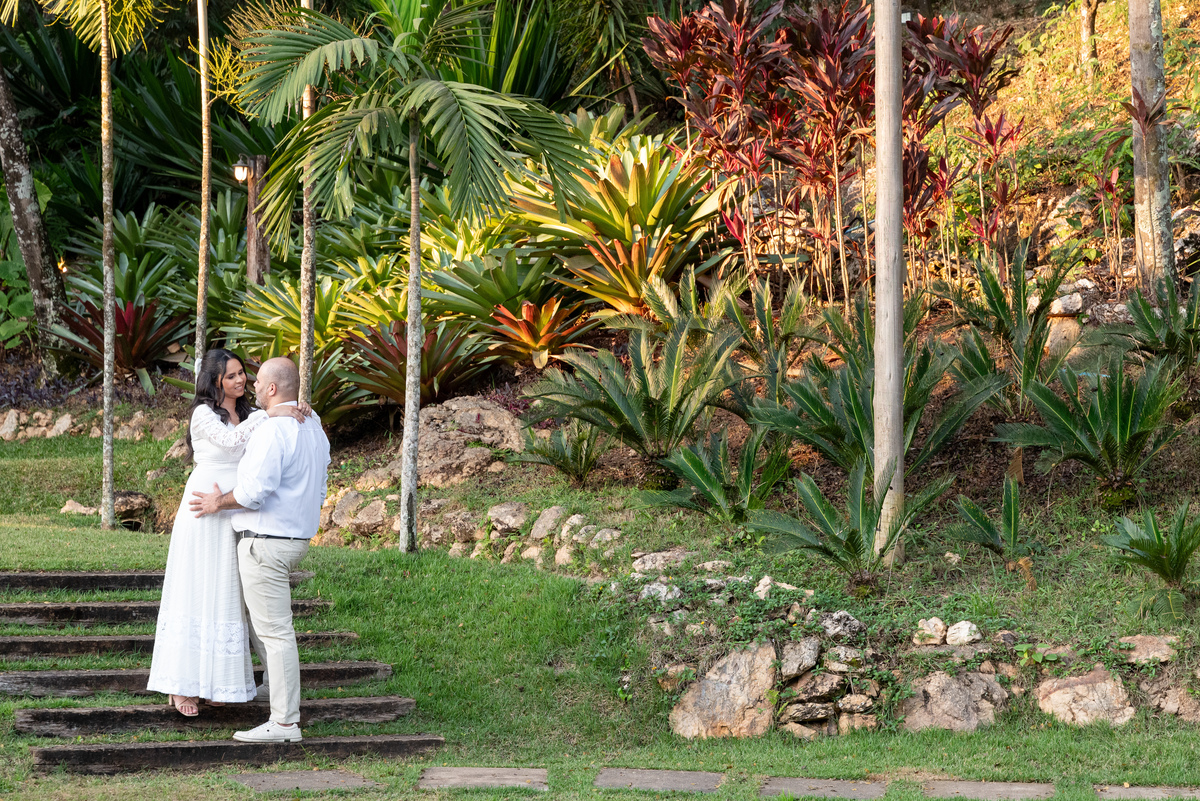 O ponto alto do ensaio foi ao pôr do sol. Com o céu azul Isabela e Bruno se posicionaram em frente ao lago do Espaço Sanctuarium, cujas águas refletiam as cores vibrantes do entardecer. Aproveitamos esse momento mágico para capturar imagens que mais pareciam pinturas, com o casal abraçado, trocando olhares apaixonados.